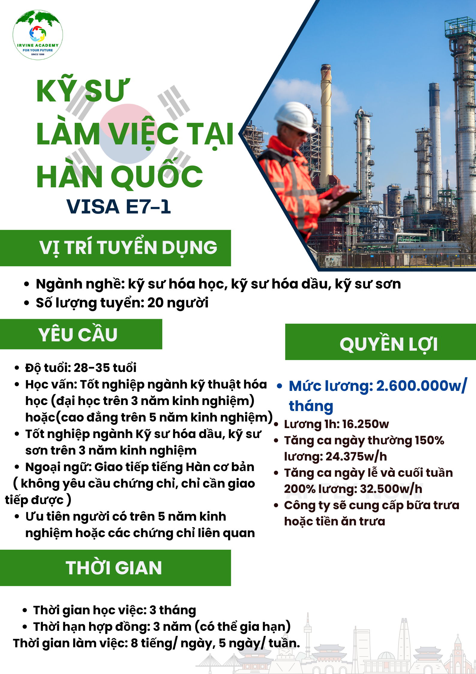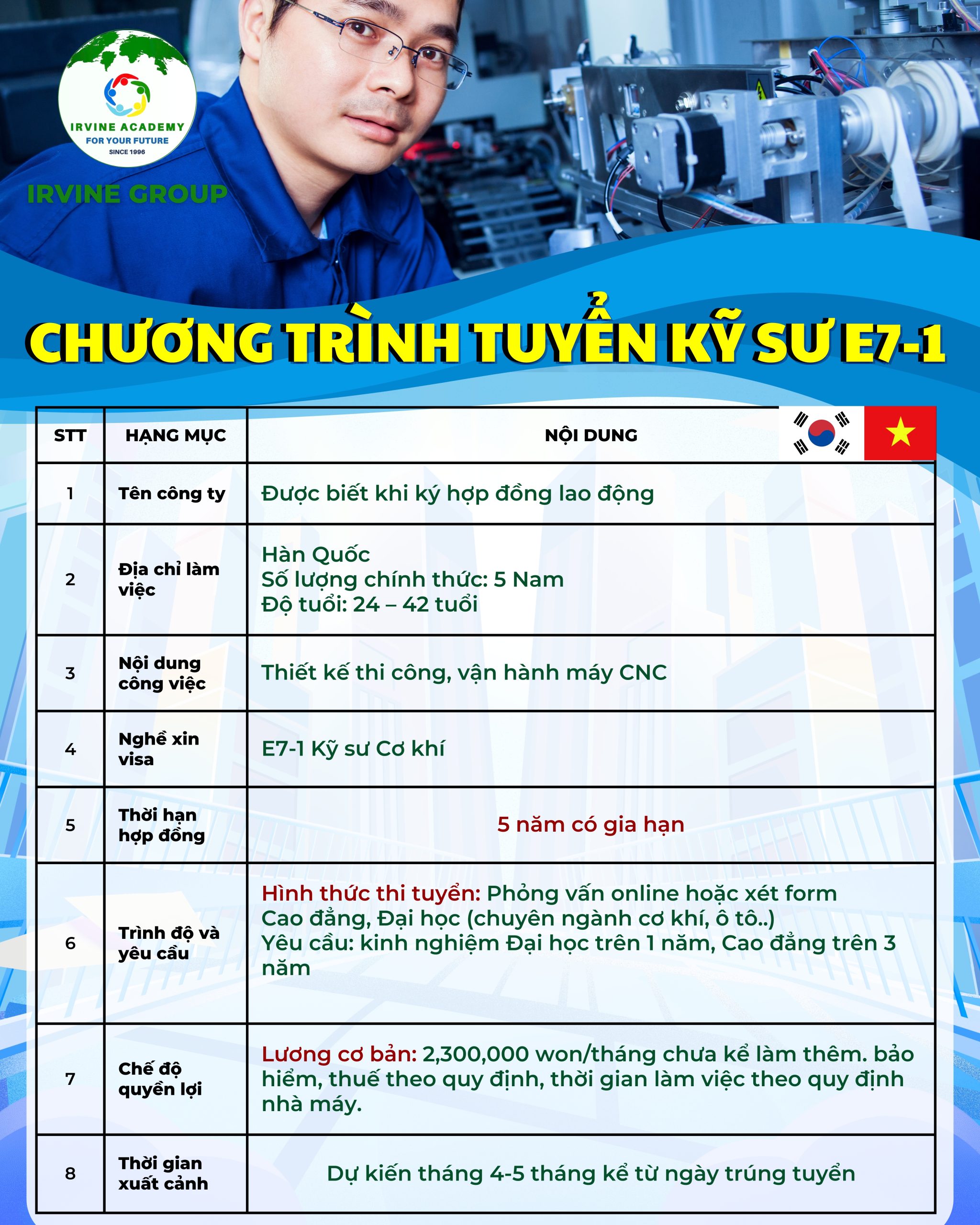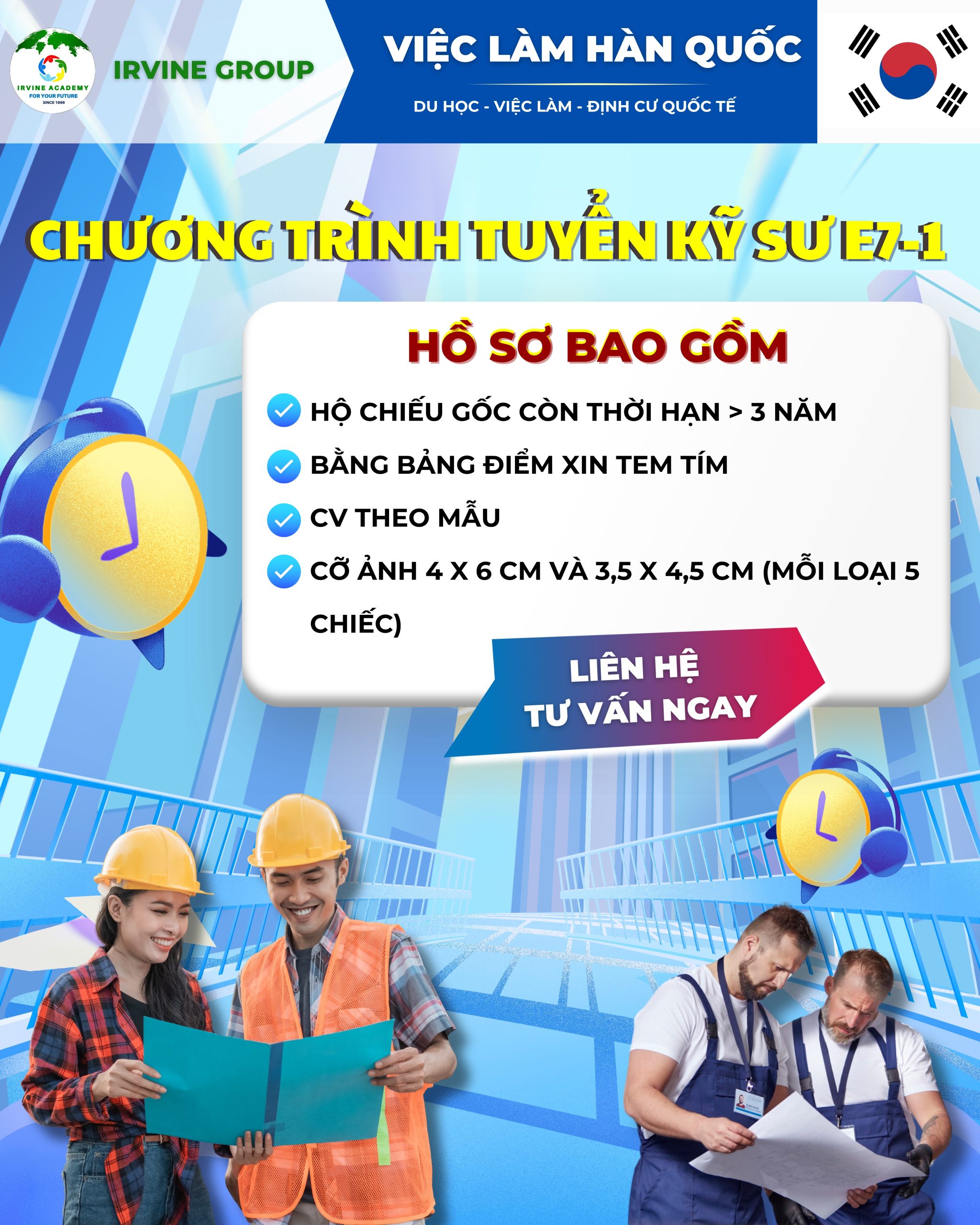 Nếu bạn muốn biết thêm chi tiết về chương trình tuyển dụng Kỹ Sư E7-1 tại Hàn Quốc, đừng ngần ngại liên hệ ngay với Irvine Group. Chúng tôi luôn sẵn sàng tư vấn và hỗ trợ bạn trên con đường sự nghiệp quốc tế.