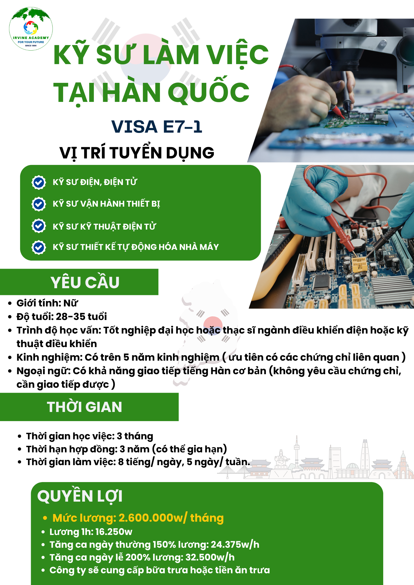 Chương trình tuyển dụng Kỹ Sư E7-1 tại Hàn Quốc mang đến cho bạn một cơ hội tuyệt vời để thay đổi cuộc đời. Với mức lương cao, hợp đồng ổn định, và môi trường làm việc chuyên nghiệp, bạn sẽ có cơ hội học hỏi, phát triển nghề nghiệp và xây dựng một tương lai tươi sáng tại một trong những quốc gia phát triển nhất thế giới.